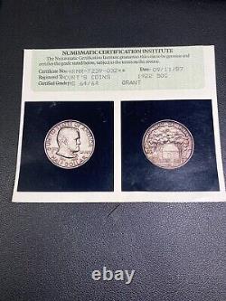 This is a 1922 US Grant 50c silver coin, minted in Philadelphia. It is a commemorative coin featuring a Civil War theme. The coin is uncirculated and has a fineness of 0.9. It is ungraded and uncertified. The coin includes a photo-certificate from NCI.
